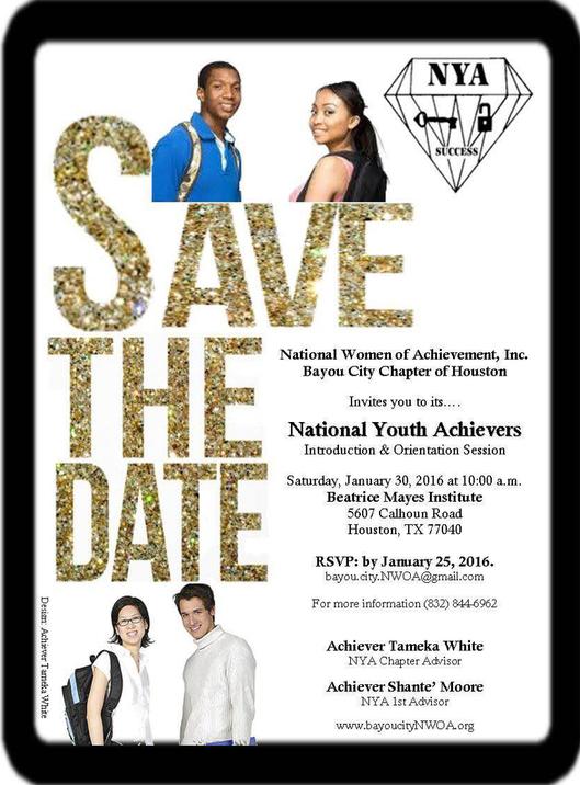 In keeping with the vision of our beloved founder, in 1983, under the administration of Achiever Carrie Davis, an official youth auxiliary if the National Women of Achievement was established, which were GEMS. In 1989, the National Youth Achievers name was adopted.In 1991, the National Youth Achievers was officially organized under the guidance of Co-Director Achiever Beatrice Mayes, along with Achiever Mildred Woodson and Achiever Willie Kennedy with four charter chapters: Houston, Missouri City, Galena Park and Winston-Salem. The first president of National Youth Achievers was Youth Achiever Charrise Barron of the Houston Chapter.Between 1991 and 1995, under the leadership of National Director Beatrice Mayes the National Youth Achievers experienced phenomenal growth, expanding from the original four chapters to 20 chapters with over 400 active members across the United States.
